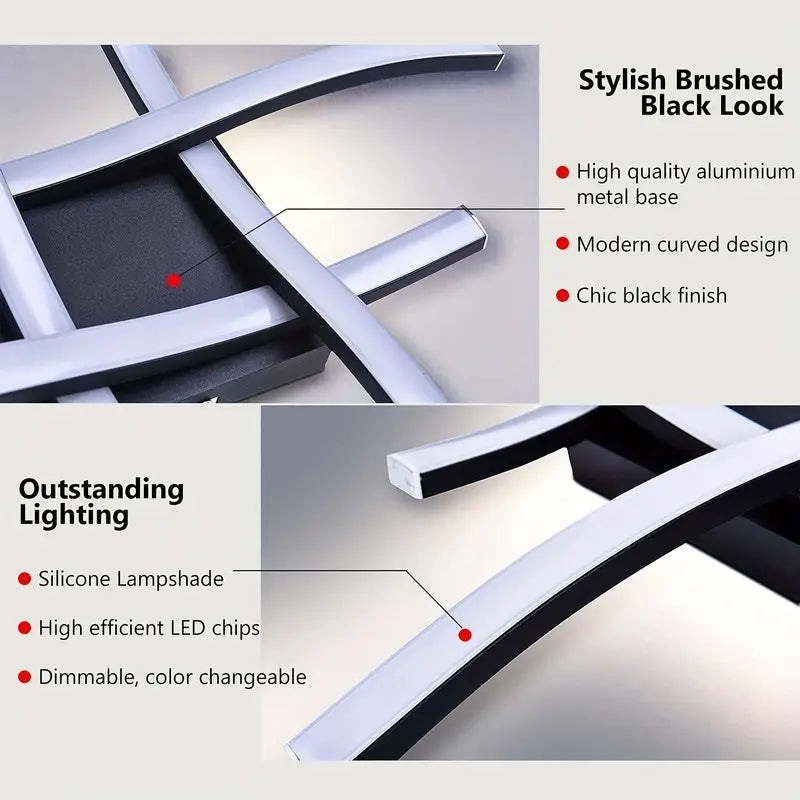 Ce plafonnier LED contemporain allie esthétique géométrique et fonctionnalité. Sa structure courbée en alliage d'aluminium abrite 4 panneaux lumineux intégrés, diffusant un éclairage uniforme et apaisant. Conçu pour s'adapter aux plafonds standards (montage semi-encastré), il s'intègre parfaitement dans les pièces résidentielles et professionnelles.